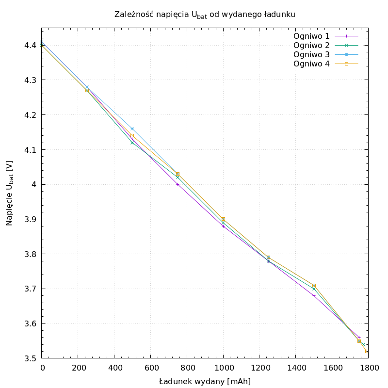 Cztery ogniwa, każde naładowane do pełna, rozładowałem porcjami po 250mAh, po każdej porcji mierzyłem napięcie na biegunach ogniwa w układzie przedstawionym powyżej.
